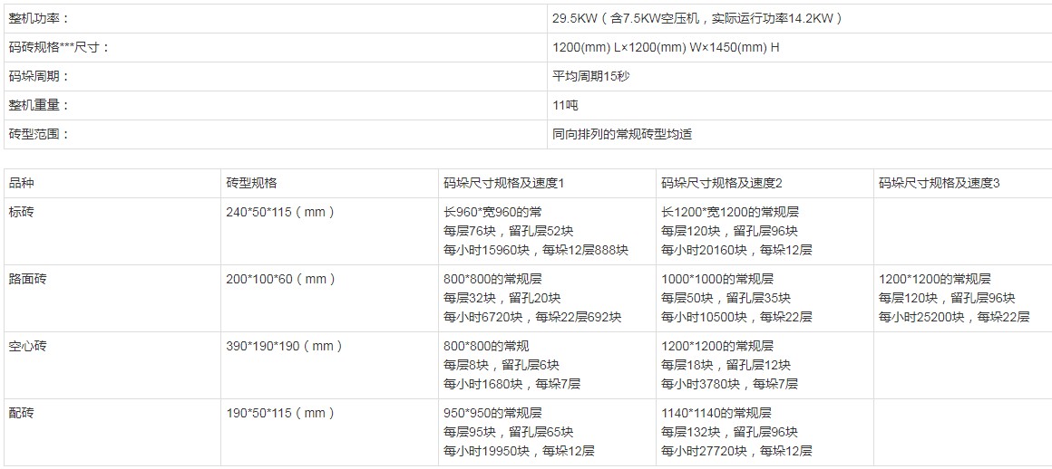 各種機型都能使用(4型機、5型機、6型機、8型機、10型機、12型、15型機等均可使用)常見各種水泥磚型可智能連接自動穿劍打包機或薄膜拉伸纏繞膜包裝機,也可以串聯全自動砌塊成型機生產線之中,實施在線碼垛。碼磚機功能技術先進,自動化程度高,有自動預留叉車孔, 自動收放托架功能、將不同型號磚機生產的不同磚制品進行磚板分離,排磚整理后碼垛成方垛(標磚實心磚一次碼垛可達1.2*1.2米)穿箭自動打包,再配合叉車或抱磚機輸送到堆放場地,無需托盤,全過程只需要一個人操作,操作簡單,動作